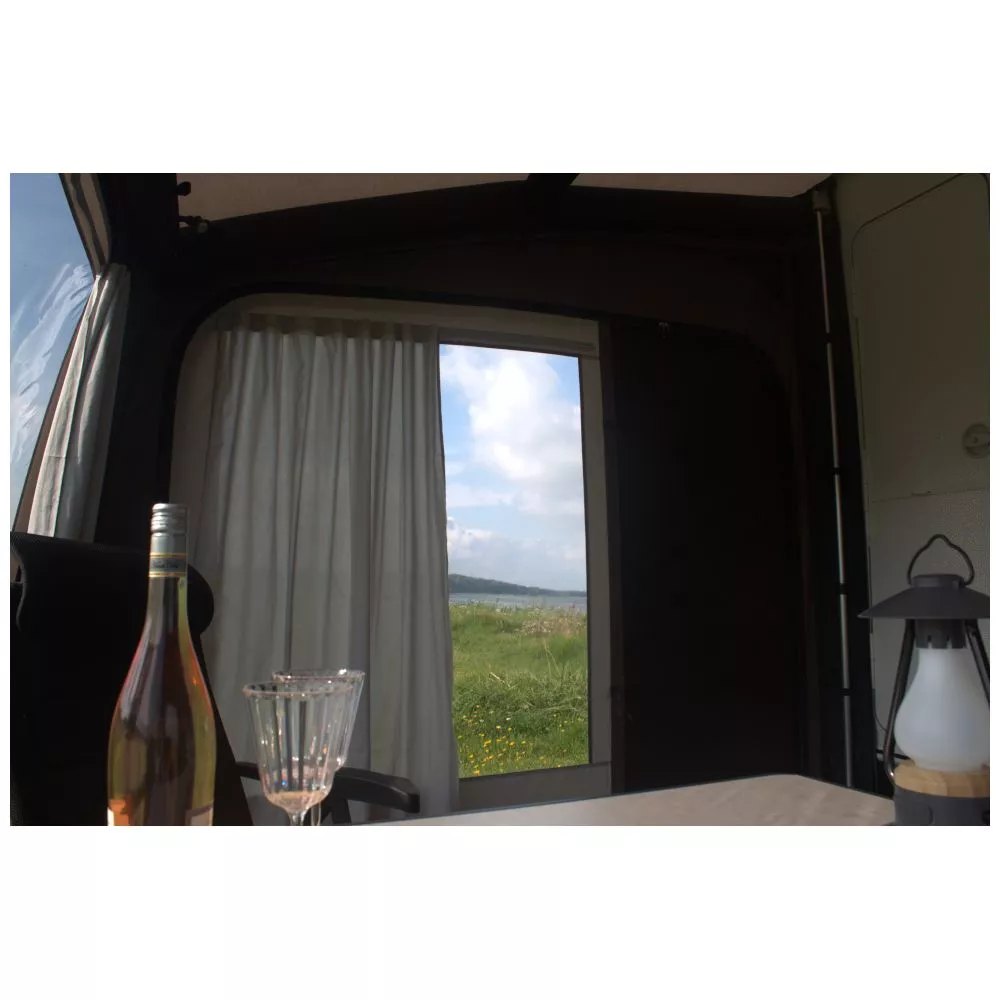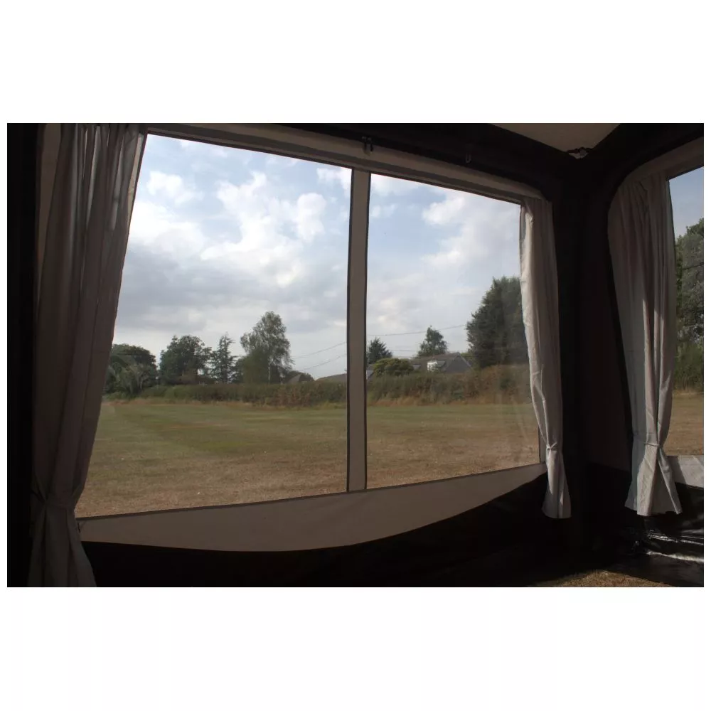 Dadurch entsteht im Handumdrehen ein geräumiges Luxus-Vorzelt mit Panoramafenstern, die viel Licht hereinlassen. So hast du an heissen Tagen die Möglichkeit, tagsüber unter einem windgeschützten Vordach zu entspannen. Am Abend oder an Schlechtwettertagen machst du es dir in einem geschlossenen Wohnbereich mit bestmöglicher Innenraumnutzung gemütlich. Durch das robuste Luftschlauch-Gerüst wird bei dieser Vorzeltgrösse kein Mittelschlauch benötigt. Das bedeutet für dich, du erhältst noch mehr nutzbaren Raum und ein geringeres Gesamtgewicht. Für mehr Privatsphäre oder bei Abwesenheit können die bodentiefen Fenster mit Gardinen verschlossen werden.