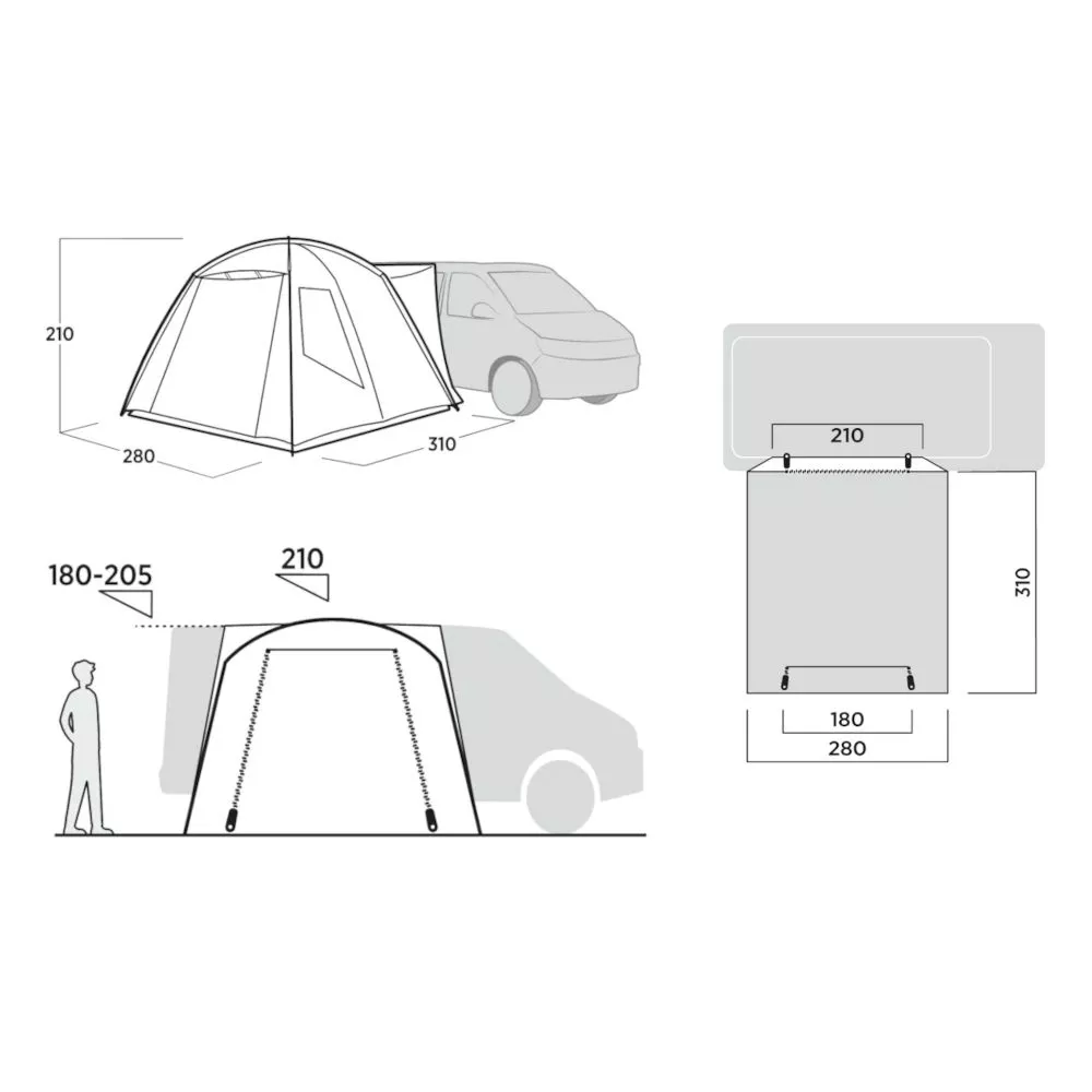 Passend für Fahrzeuge mit einer Höhe von 180 bis 205 cm. Die Schleuse dichtet eng am Fahrzeug ab und es entsteht ein regengeschützter Durchgang.