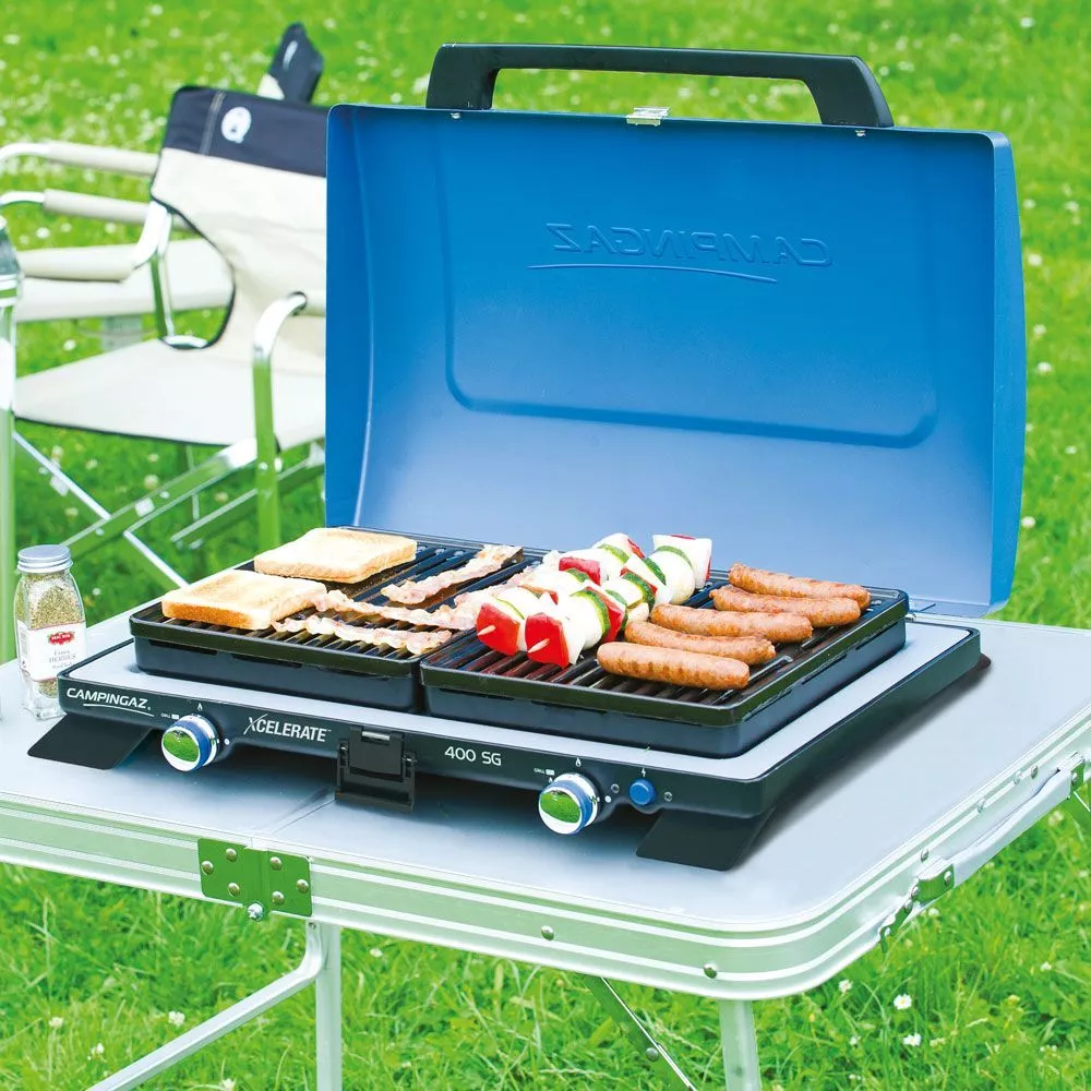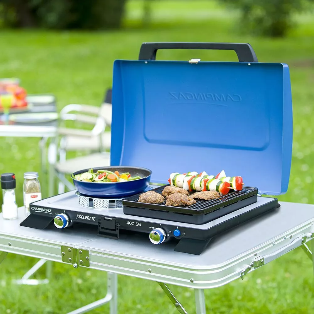 Der Campingkocher Campingaz 400 SG ist ein hochwertiger 2-Flammkocher mit zwei Grillplatten und mit robustem Deckel aus lackiertem Stahl. Die leistungsstarke und innovative Xcelerate Brennertechnologie stellt hohe Leistung und schnelles Kochen sicher, denn die Kochzeit wird bei Wind im Vergleich zu traditionellen Brennersystemen halbiert. Stabile Topfträger mit WindBlock-System erhöhen zusätzlich den Windschutz.