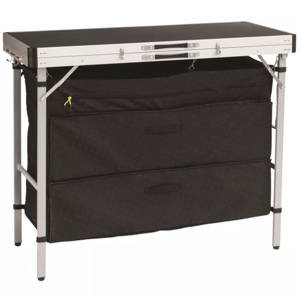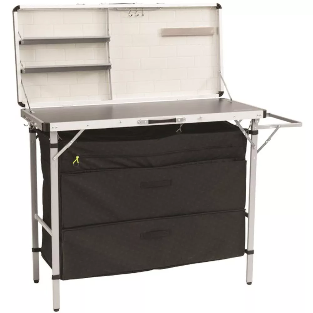 Der durchdachte Küchentisch Magante zeichnet sich durch ein stabiles Stahl/Aluminiumgestell und einen schwarzen Bezug mit Prägemuster aus. Die Tischplatte besteht aus wetterbeständigem Harz. Die Kücheneinheit Magante besticht unter anderem durch 4 komplett verschliessbare Regaleinheiten, Küchenpapierhalter und höhenverstellbaren Füssen.