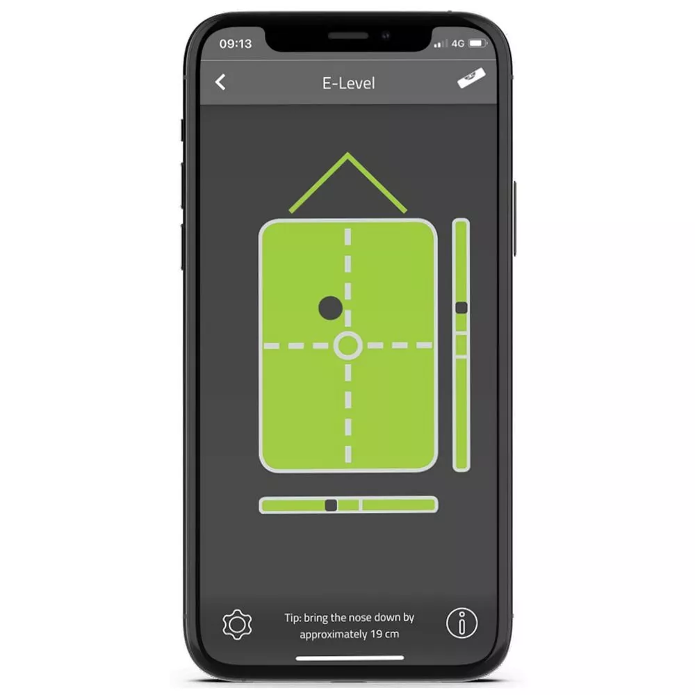 Das E-Level-Modul arbeitet mit einer elektronischen Wasserwaage und zeigt schon während der Fahrt auf den Campingplatz oder Stellplatz an, ob dein Fahrzeug eben steht. Dabei kannst du die Nivellierung live auf deinem Smartphone in der E-Trailer-App sehen und weisst sofort, wo du ausgleichen musst.