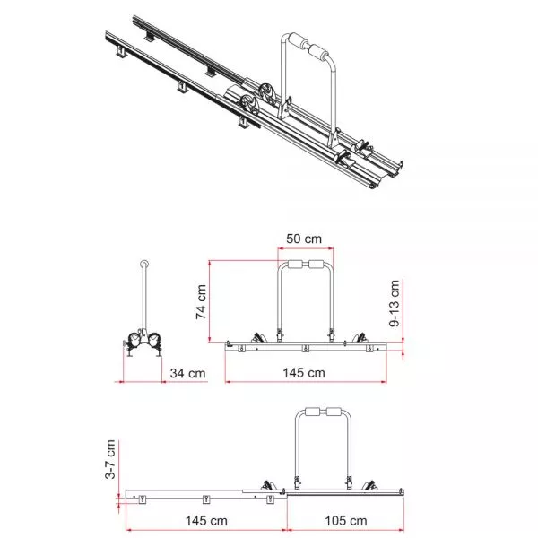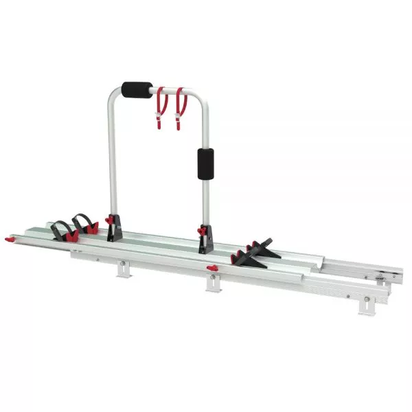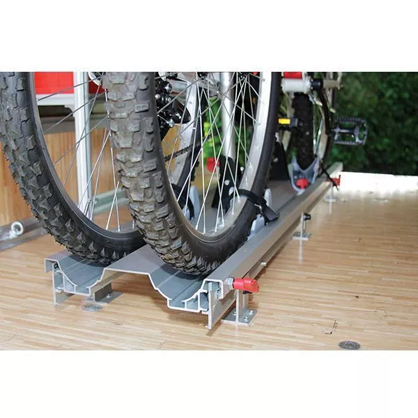 Der Fahrradträger bzw. Veloträger Fiamma Carry-Bike Garage Slide Pro Bike zur sicheren Anbringung in der Wohnmobilgarage für zwei Fahrräder / Velos. Der herausziehbare Fahrradträger für die Heckgarage ist höhenverstellbar von 9 bis 13 cm und 34 cm Breite für eine komfortable Montage. Das patentierte Gleitsystem sorgt für eine sanfte und bequeme Bedienung. Der Carry-Bike Garage Slide Pro Bike besteht aus eloxiertem Aluminium. Das untere Profil wird am Boden angeschraubt, während das obere Profil auf leisen Stahlrollen aus Nylon bedeckt zwischen den Schienen läuft (Kugellagerung). Der Fahrradträger kommt komplett mit Sicherheitsbefestigungen sowohl im eingefahrenem als auch ausgefahrenem Zustand.