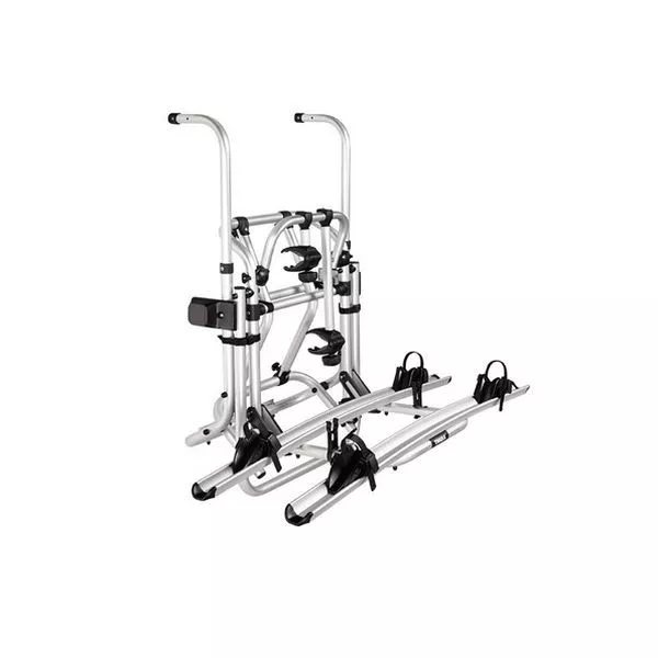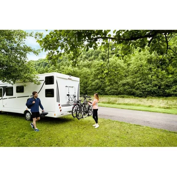Der Fahrradträger Thule Lift V16 Manual ist entwickelt, für eine stabile und haltbare Befestigung an der Rückwand eines Reisemobils oder eines Wohnwagens. Der Heckträger bietet Platz für 2 Räder, ideal auch für E-Bikes. Es können Mountain Bikes und Kinderräder transportiert werden, stellen Sie dazu einfach die Radhalter ein. Zudem kann mit einem optionalen Erweiterungskit einen dritte Schiene und somit ein drittes Rad befestigt werden. Der Schienenbügel wird mit einer Kurbel abgesenkt und hochgefahren. Damit ist Ihnen das Be- und Entladen mühelos möglich. Dank der Liftfunktion kann eine Höhe von 70 cm überbrückt werden und auf bis zu 95 cm gebracht werden. Die Plattformverriegelung bietet eine ausgezeichnete dynamische Lastenkontrolle und sorgt für einen festen Halt der Räder, auch während des Transports. Da die Plattform manuell verriegelt wird, kann sie bei Nichtverwendung einfach in hochgeklappter Stellung eingerastet werden. Durch die integrierten Sicherheitsriemen wird der Lift-Rahmen stabil und sicher gehalten.