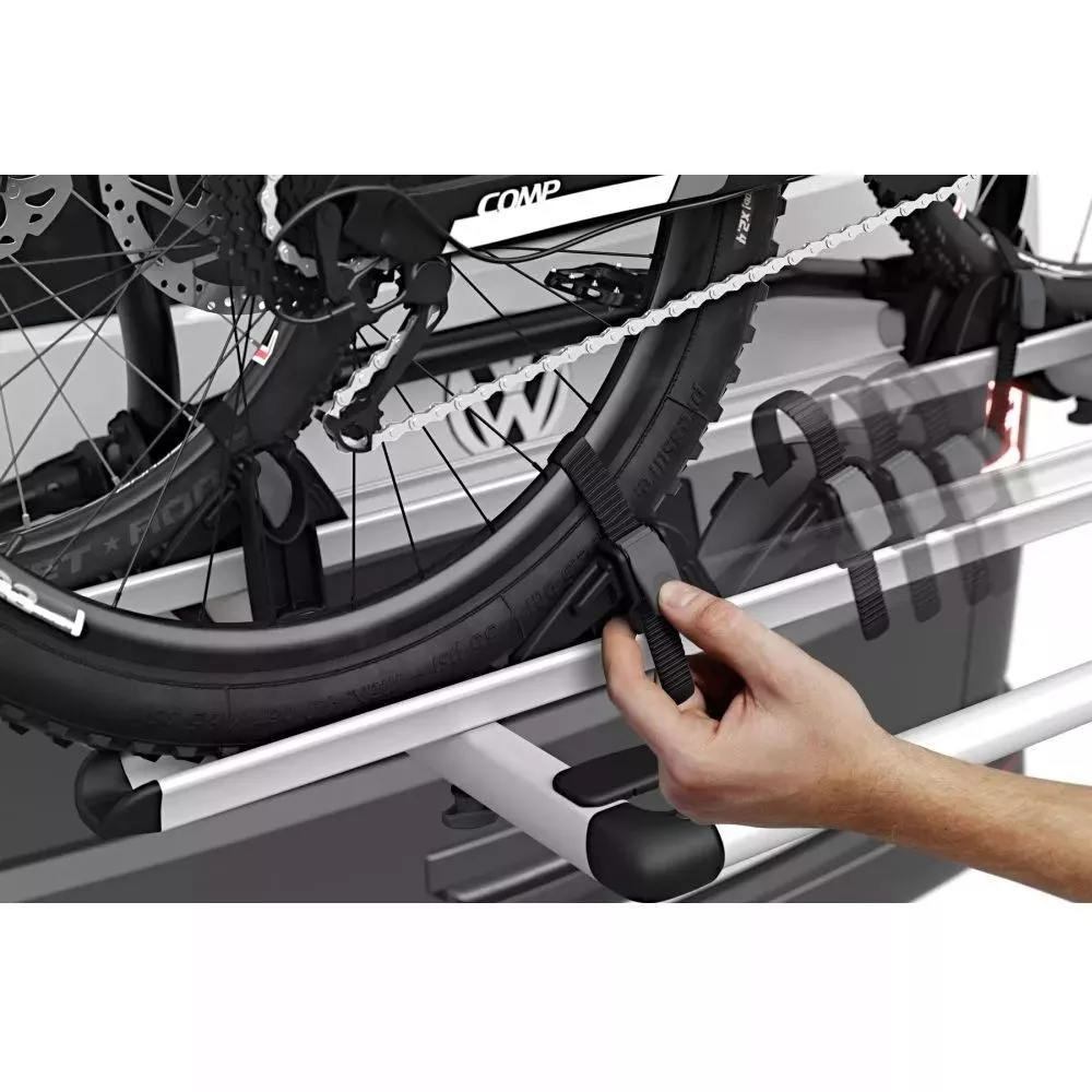 - Felgenhaltebänder mit Ratschenfunktion für bequemes Befestigen der Velos