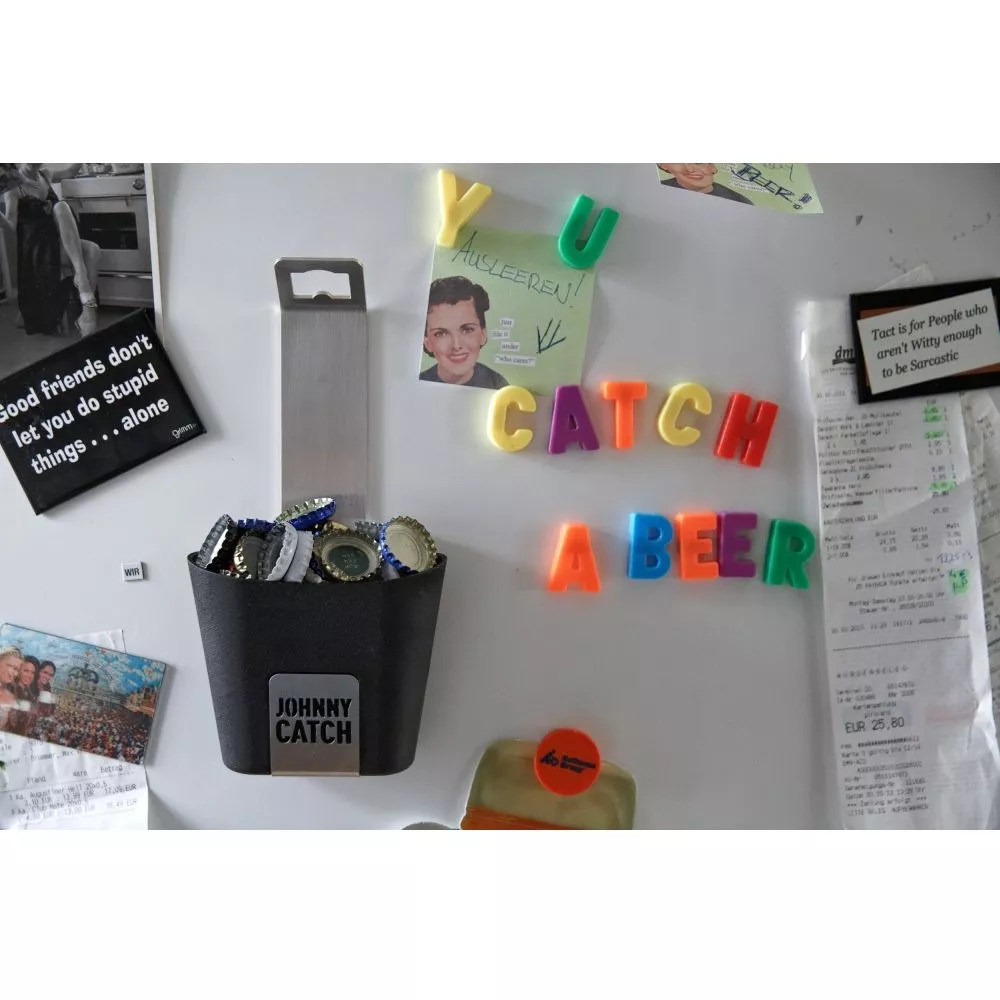 So fangsicher kann der Höfats Johnny Catch Cup Wand-Flaschenöffner sein! Dieses unverzichtbare Party-Tool aus gebürstetem Edelstahl und Soft-Touch Auffangbecher beendet den freien Fall von Kronkorken! Der Höfats Johnny Catch Cup ist immer zur Stelle und fangbereit.