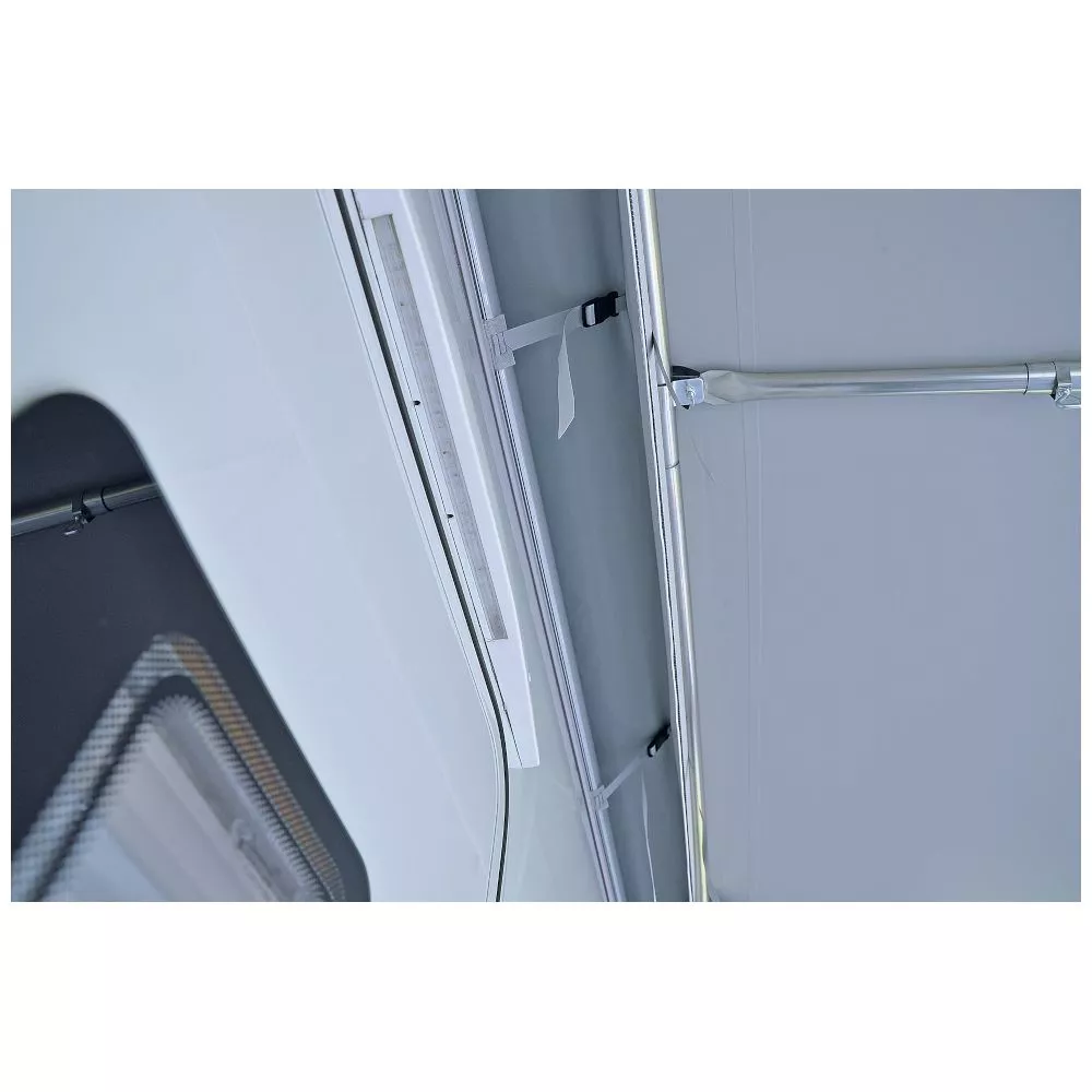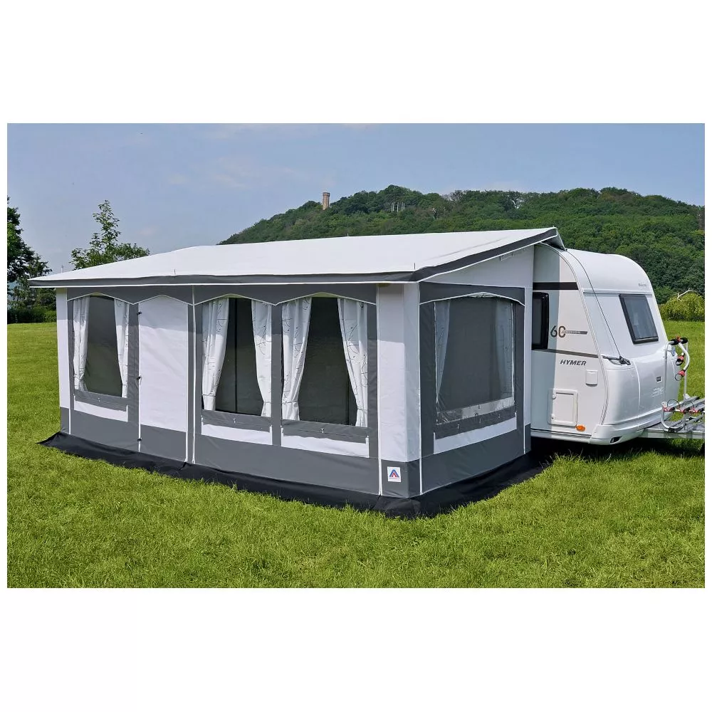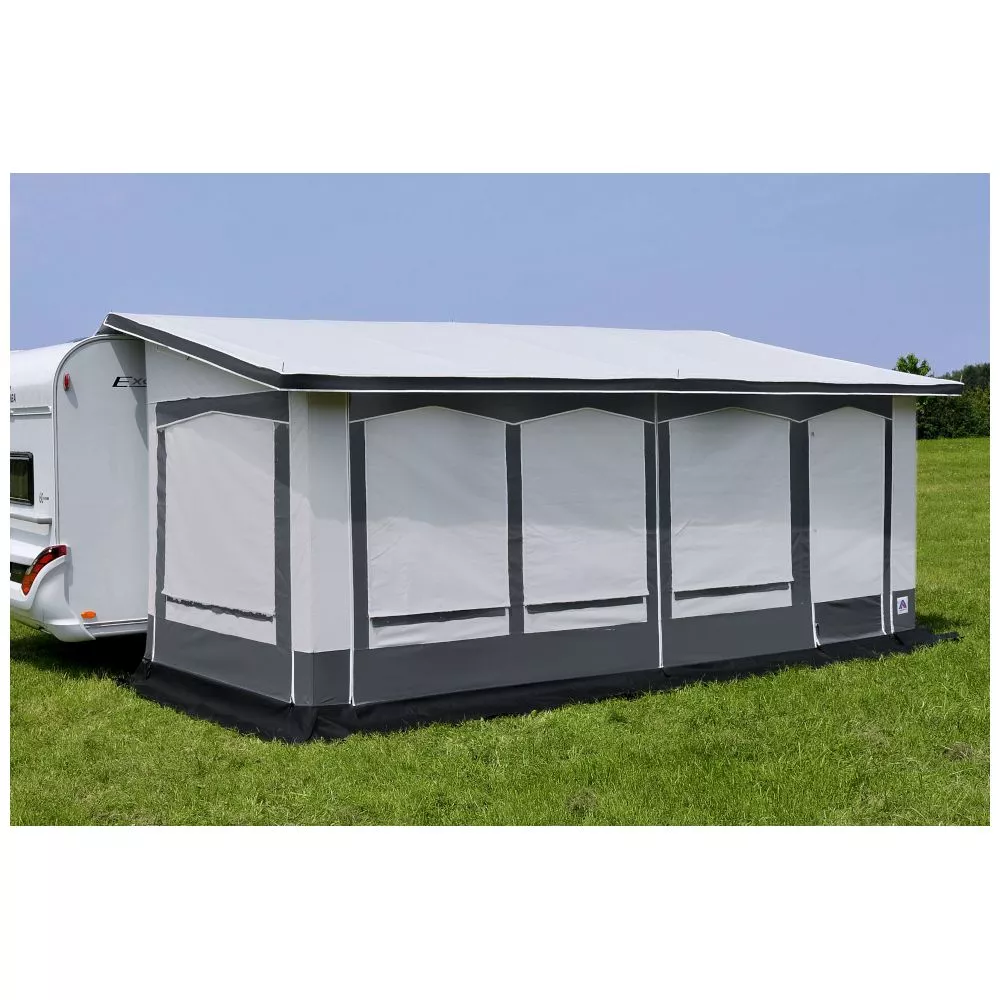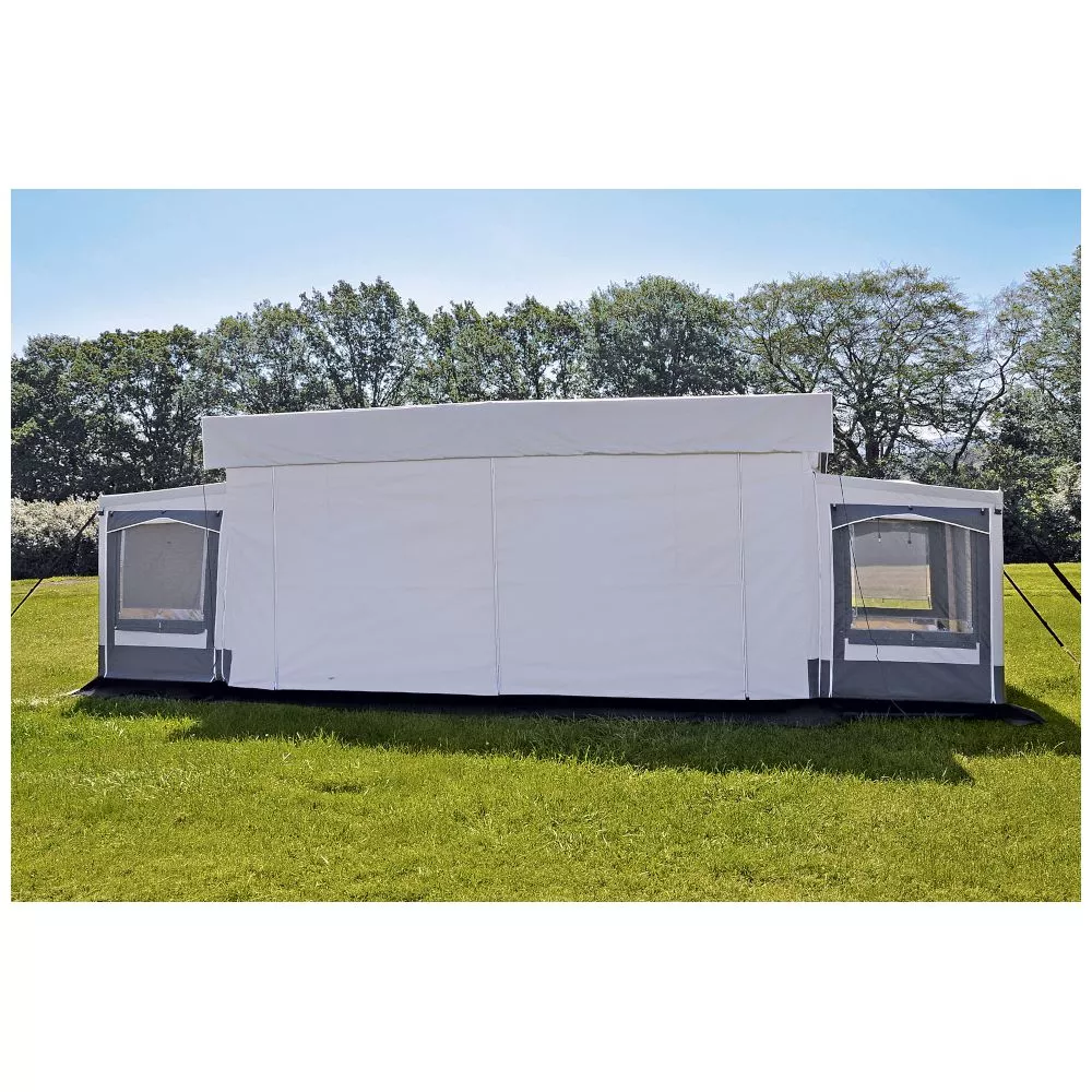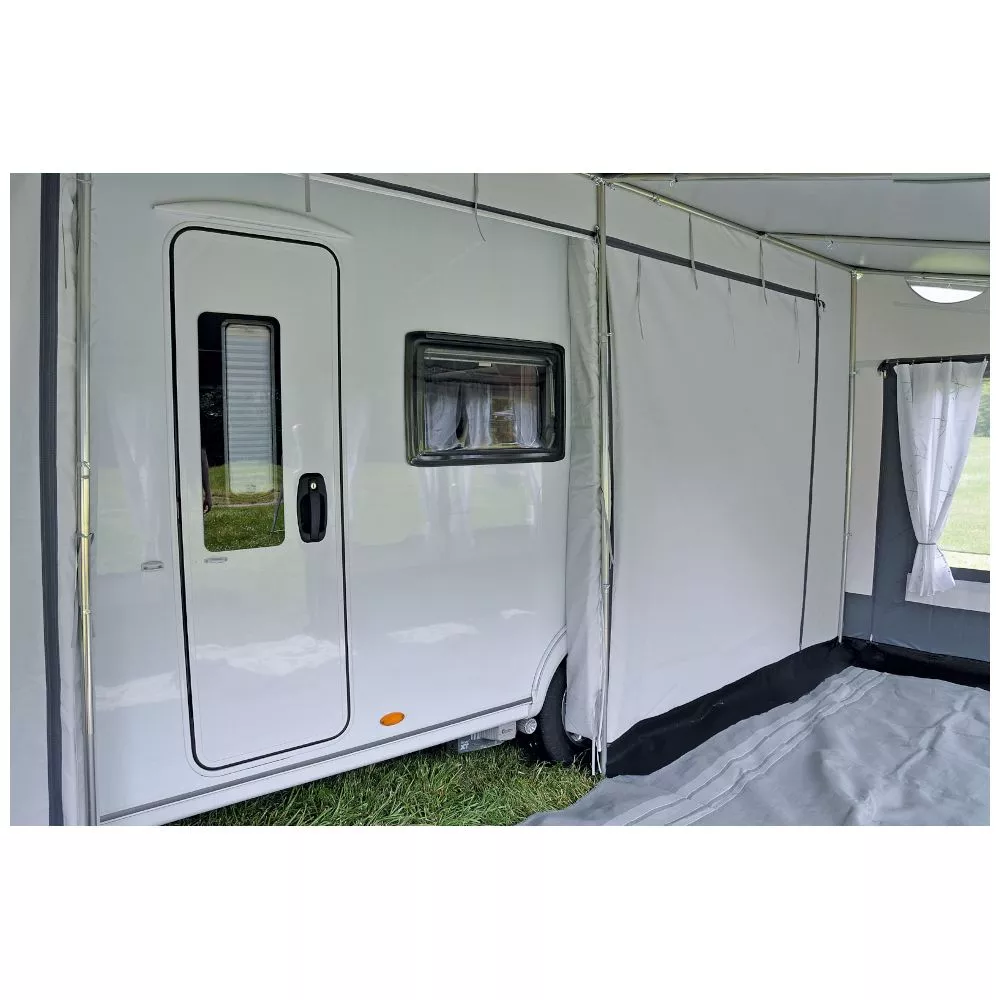 Mit einer Tiefe von 250 cm bietet dir dieses Wohnwagenvorzelt ausreichend Platz zum Verstauen deiner Ausrüstung und zum Einrichten eines gemütlichen Wohnbereichs vor dem Caravan. Bei der Gestaltung und Aufteilung in Sitzecke, Spielecke, gemütlichem Wohnzimmerflair oder Eingangsbereich sind dir hierbei keine Grenzen gesetzt. Dank der zweiteiligen Vorderwand, den abklappbaren Vorder- und Seitenelementen und den grossen Panoramafenstern mit Gardinen hast du unzählige Möglichkeiten, passend für jede Tages- und Nachtzeit geboten.