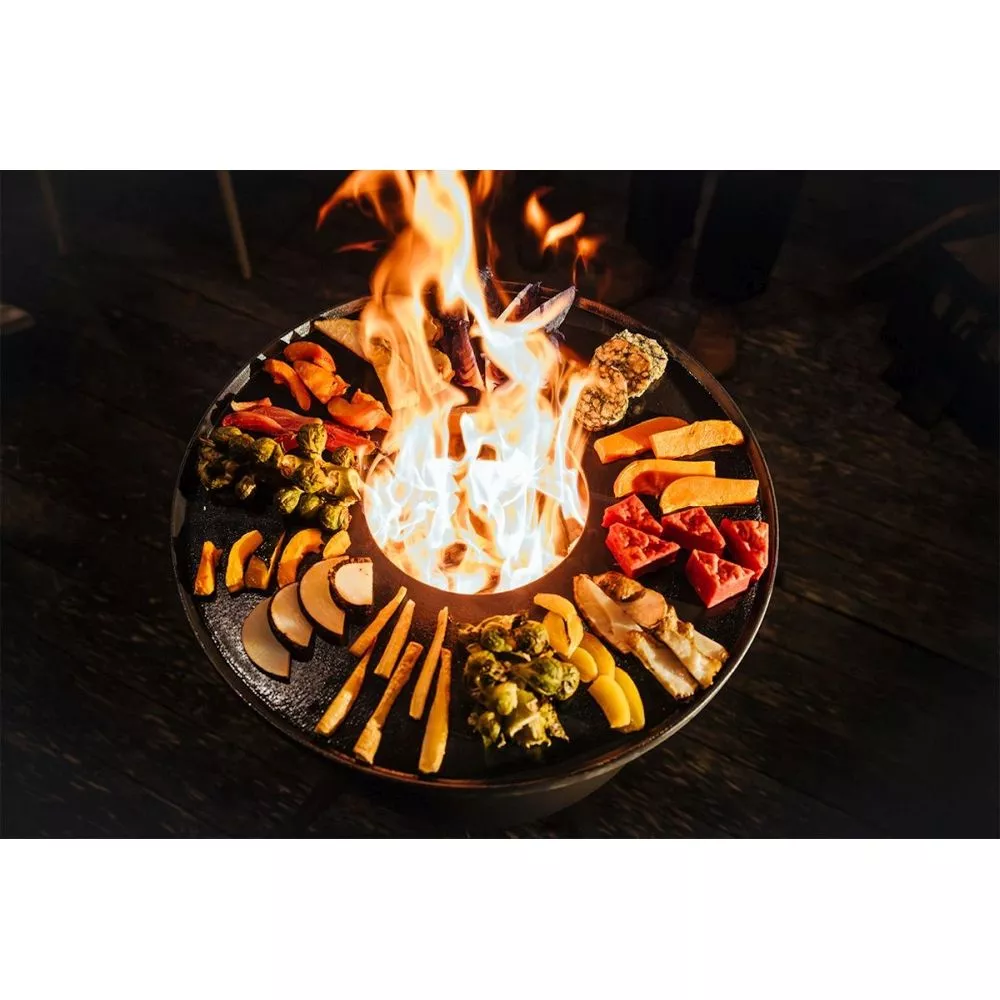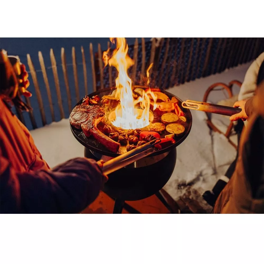 Mit Holz oder Pellets befeuert, erzeugt der MOON Feuerkorb präzise Hitze, um kreative Grill- und Kochkünste zu entfalten. Der Plancha-Ring bietet reichlich Platz für Leckereien aller Art, die dank optimaler Wärmespeicherung und Antihaftbeschichtung der gusseisernen Platte fettarm zubereitet werden können und den kulinarischen Spielraum über den Flammen erweitern.