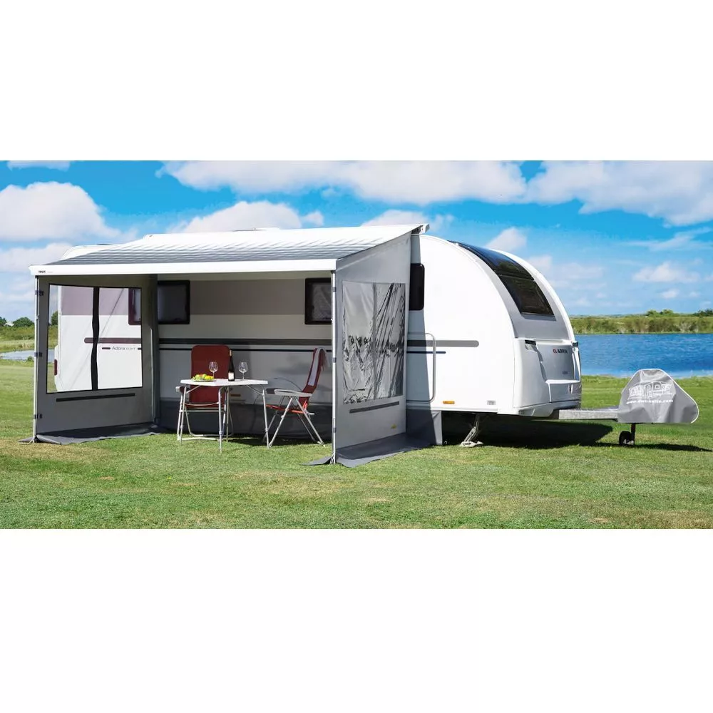 Wenn du eine optionale Vorderwand dazu wählst, hast du ein robustes Markisenvorzelt und bist gerüstet für jegliche Wetterlage. Damit das entstehende Markisenvorzelt auch optimal mit dem Fahrzeug verbunden ist, können optional erhältliche Schaumstoffwulste und Andruckstangen fahrzeugseitig ergänzt werden. Um Seitenwände und die optionale Vorderwand verbinden zu können, ist ein optionaler Verbindungsadapter notwendig.