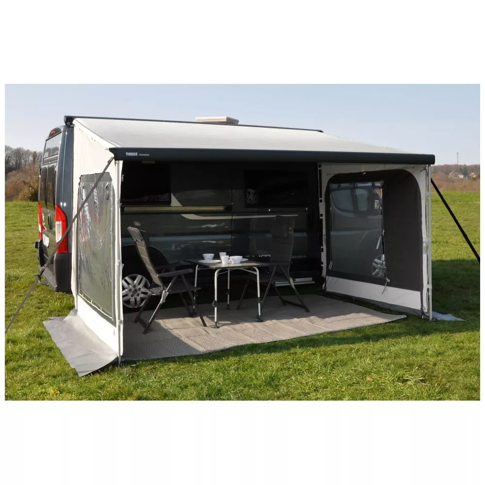 Mit dem Markisenzelt Hahn Korsika 2.0 verwandelst du deine Thule Omnistor Markise in einen geschlossenen Vorzeltbereich vor deinem Fahrzeug. Das Korsika 2.0 ist zur Montage an allen Thule Omnistor 5200 Markisen mit einem Auszug von 2,5 Metern und einer Breite von 3,5 Metern geeignet. Die Seitenwände werden dabei für eine sichere Verbindung zum Markisentuch mittels im Lieferumfang enthaltener Klemmprofile befestigt. Die Vorderwandelemente ziehst du einfach in die Kederschiene deiner Markise ein.