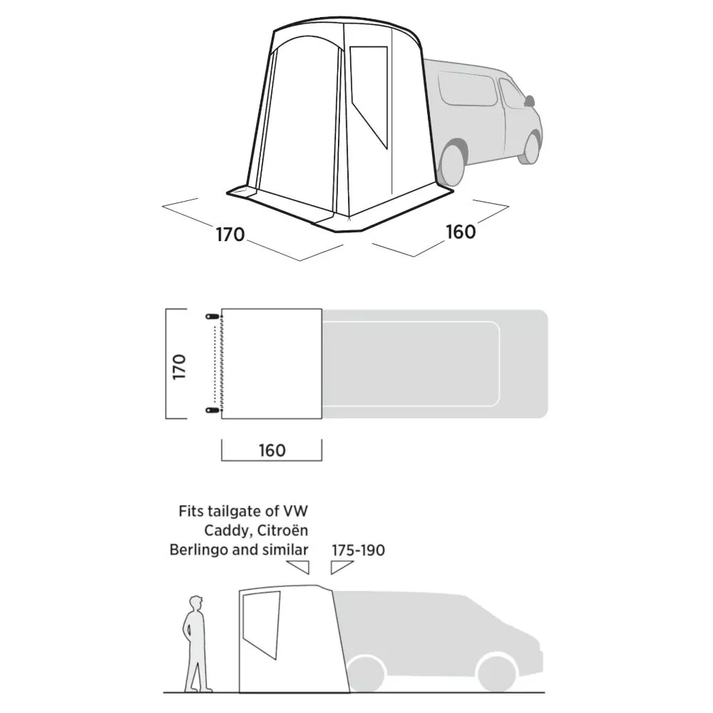 Mit dem vielseitig einsetzbaren Easy Camp Krossbu Mini Heckzelt erweiterst du die Grenzen und den Wohnraum deines Campingfahrzeugs. Mit zwei Abspannleinen wird das Zelt schnell, einfach und sicher an der Heckklappe befestigt. Geeignet für Fahrzeuge mit einer Anschlusshöhe von 175 – 190 cm.