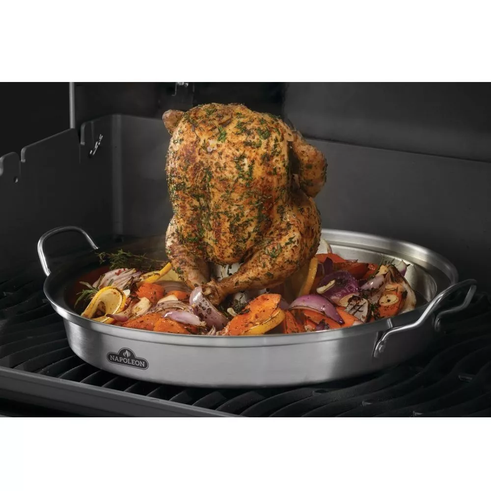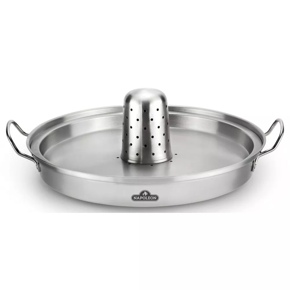 Der Napoleon 3in1 Geflügelhalter aus Edelstahl, bestehend aus drei einfach abzunehmenden und spülmaschinenfesten Teilen. Flüssigkeit in die untere Pfanne giessen, Deckel einsetzen, darauf kann Gemüse gegart werden. Anschliessend den Hähnchenhalter-Aufsatz montieren und das Hähnchen darauf platzieren.