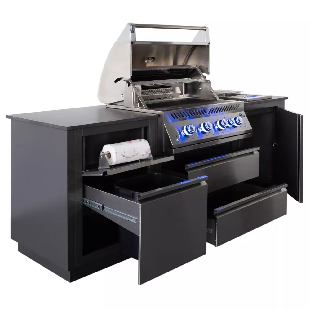 Das Herzstück ist der Einbauschrank auf welchem der Einbaugrill montiert wird. Hier befinden sich unterhalb des Grills zwei grosszügige Schubladen für sämtliches Grillzubehör wie Besteck, Geschirr, Töpfe und Pfannen. Auf der linken Seite befindet sich ein grosser Multifunktionsschrank mit gleich zwei praktischen Details. In der oberen Schublade befindet sich ein herausklappbarer Küchenrollenhalter und im unteren Bereich ein grosszügiger Abfallbehälter mit Auszug. Auf der rechten Seite, unterhalb der Sizzle Zone, ist ein spezieller Schrank für die Unterbringung der Gasflasche vorgesehen. Hier kann die Gasflasche bequem und sicher aufbewahrt werden und ist durch eine Tür leicht zugänglich.