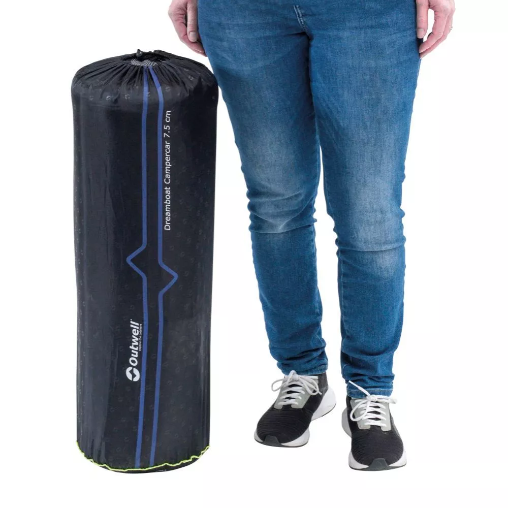 Camping im Auto! Bei der Campingmatte Outwell Dreamboat Campercar 7.5 cm handelt es sich um eine weiche und sehr komfortable selbstaufblasbare Liegematte für SUV. Passend für Fahrzeuge wie den Tesla Y, Skoda Enyaq. Diese selbstaufblasende Liegematte ist mit dem Outwel FHF-Ventil (Flat High-Flow Valve) ausgestattet – einem flachen Ventil, das sowohl beim Aufblasen als auch beim Ablassen der Luft einen hohen Luftstrom ermöglicht. Die Seitenwände aus Textil biegen sich unter Druck nicht durch, wodurch sich das Aufblasen einfacher gestaltet, weil weniger Luft zugeführt werden muss. Darüber hinaus sorgt die Matratzenkonstruktion mit ihrem tiefen Profil und ihrer Extrabreite für einen Komfort, den die Camper sonst nur von daheim kennen. Abgerundet wird dieses überzeugende und überaus komfortable Produkt durch beste Dämmwerte. In Anbetracht ihrer Abmessungen besitzt diese Liegematte ein verhältnismässig geringes Gewicht und ein relatives kleines Packmass.