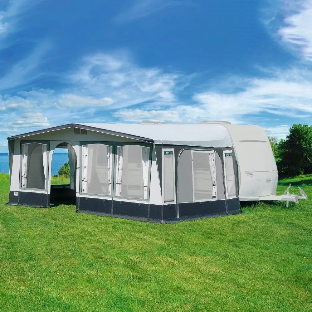 Platziere den Eingang ins Zeltinnere dort, wo du ihn brauchst bzw. wie es dein Stellplatz auf dem Campingplatz erfordert. Denn die Elemente der Front lassen sich beliebig einsetzen. Auch in den Seitenwänden sind Eingänge möglich. Dank der Easy-Zip-Ausführung lassen sich Vorderwand- und Seitenwandelemente schnell zu einer luftigen Veranda-Lösung abklappen (Balkonstangen nicht inklusive). An heissen Sommertagen können auch alle Wandelemente für eine luftige und Schatten spendende Wohnwagen-Sonnendach-Lösung vollständig entnommen werden.