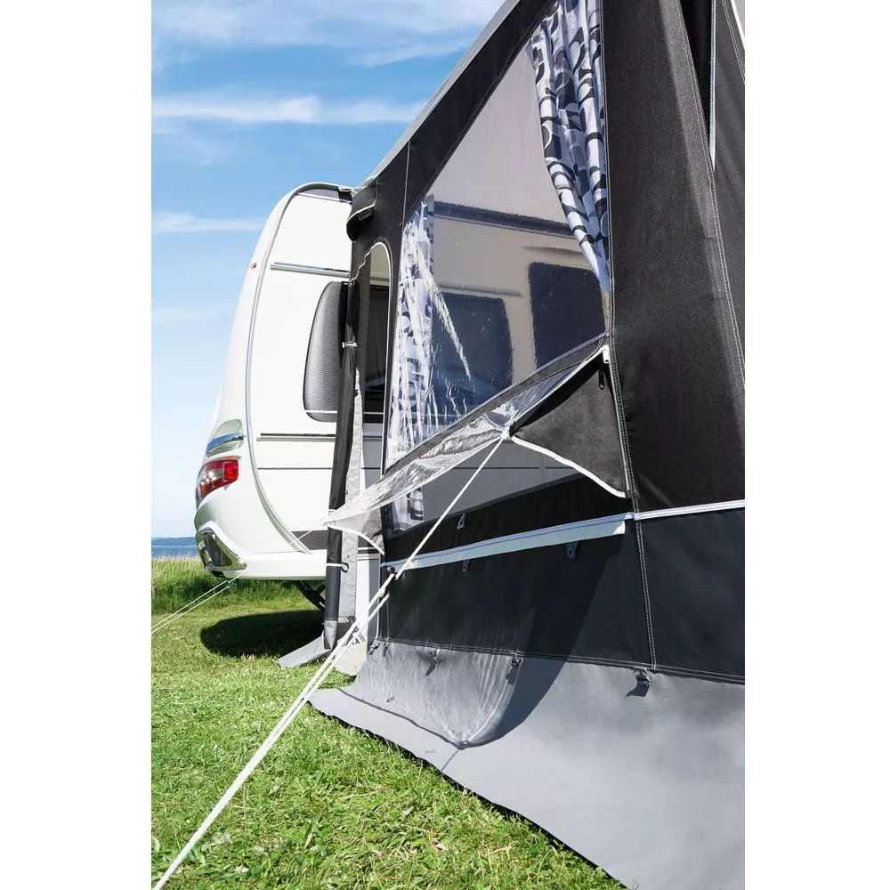 Beide Seitenwände sind mit einer seitlich wegrollbaren Tür ausgestattet. Die grossen Fenster lassen viel Tageslicht ins Vorzelt. Die modischen, mitgelieferten Gardinen schaffen eine angenehme Atmosphäre. Für eine gute Querbelüftung bei jeder Wetterlage sorgen die Moskitonetze unterhalb der Fenster mit ausstellbaren Folienklappen und die integrierten Hochentlüftungen in den Seitenwand-Elementen.