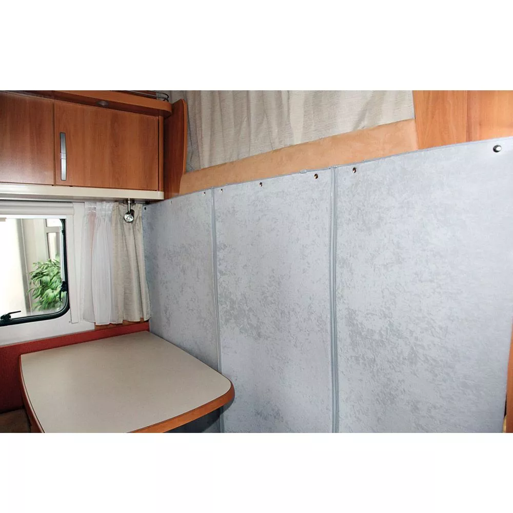 Der Hindermann Thermo-Trennvorhang für Wohnmobile mit Alkoven besteht aus einem 3-lagigen, ca. 8 mm starken Iso-Sandwichmaterial (Oberware 100% Polyester, Unterware 100% Polyurethan). Der Thermovorhang bietet optimalen Kälteschutz und isoliert die Wärme zwischen Fahrerhaus und Wohnbereich. Die Befestigung erfolgt mittels 10 Druckknöpfen. Für bequemen Durchstieg kann das Mittelteil des Trennvorhangs mit zwei Reissverschlüssen geöffnet und einfach aufgerollt werden. Für eine angenehme Atmosphäre ist der Vorhang zum Innenraum hin mit einem freundlich grauen Polyestervelours beschichtet. Die Aussenschicht besteht aus einer reflektierenden, alubedampften Polyesterfolie. Universell passend für viele Alkoven-Fahrzeuge – ein möglicherweise überstehender Rand kann entweder eingeschlagen oder von Hand zugeschnitten werden.